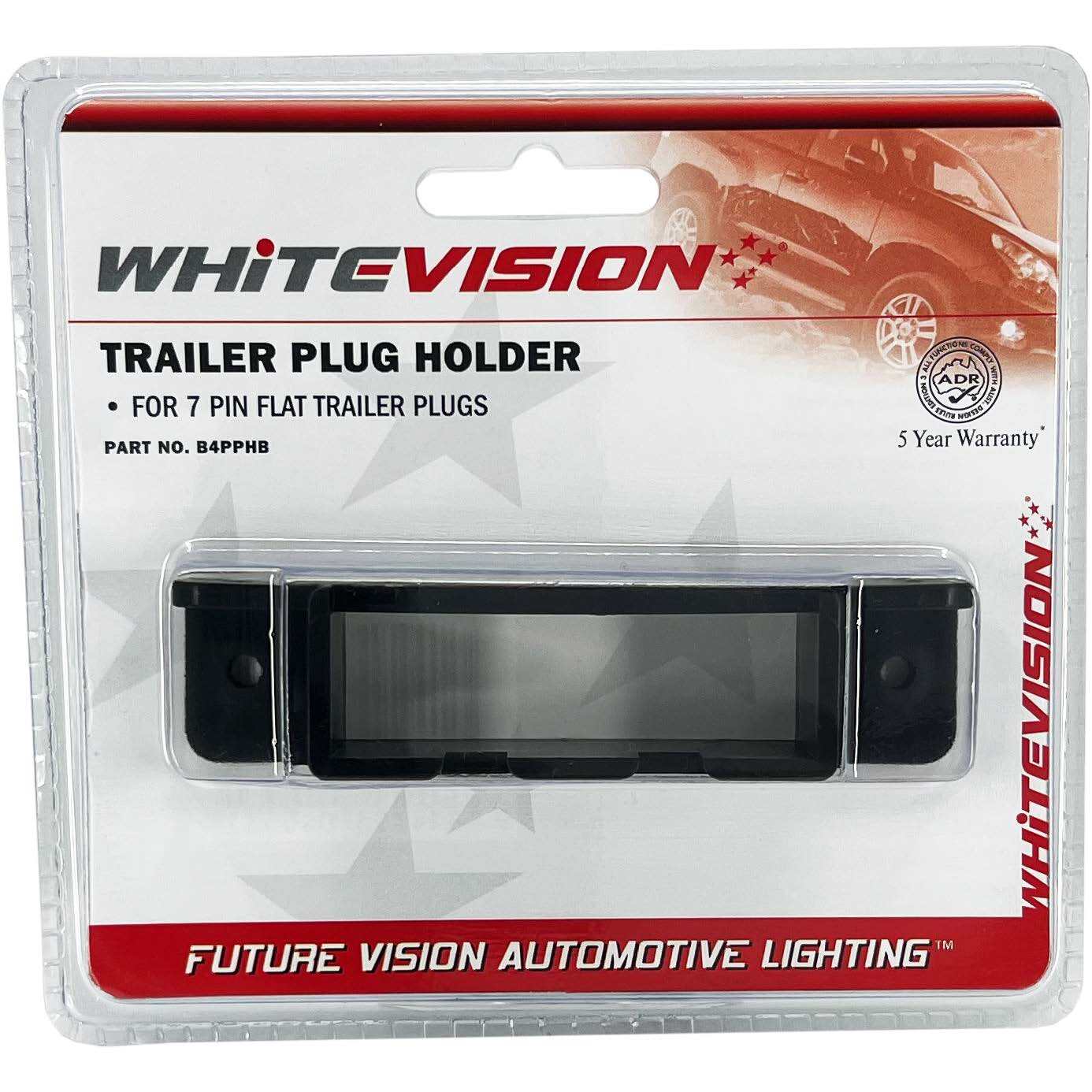 Whitevisions B4PH is a robust trailer plug holder that securely fits 7-pin flat plastic trailer plugs on the trailer when they are not in use. Designed with multiple mounting points, this holder can be easily fitted to almost any trailer. It is great for keeping trailer plugs fit and healthy. Available now in retail blister packs.